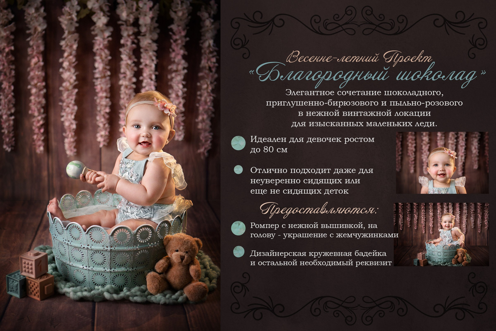 Элегантное сочетание шоколадного, приглушенно-бирюзового и пыльно-розового в нежной винтажной локации для изысканных маленьких леди